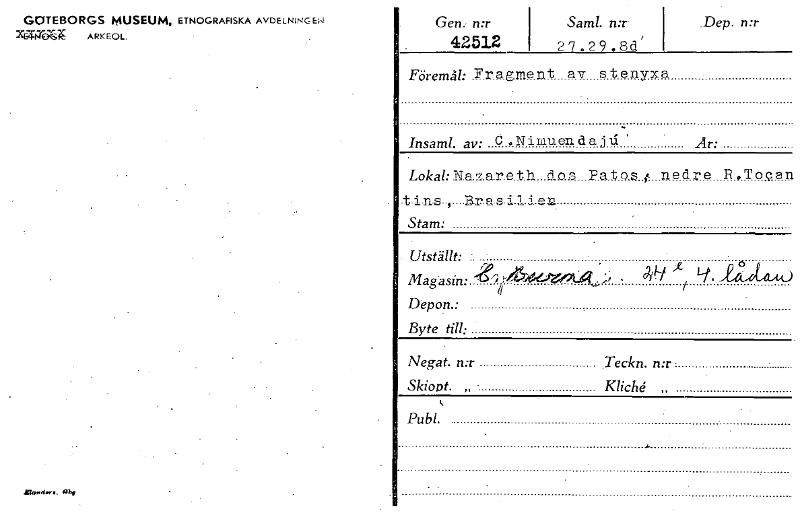 GOTEBORGS MUSEUM, ETNOGRAFISKA AvDELNNG DrE,T44", ARKEOL. Gen. n:r 42512 Sam!. 27 .29 .8d' .Dep. n:r Föremåh.Tragment av stenyxa Insaml. av: d • N inri en d a År: LokabNa.z.ar.e_th...1o.,51...P.a.t...