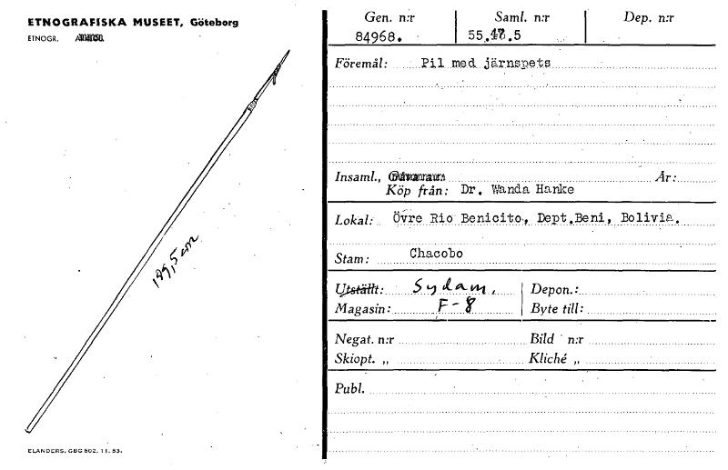 Dep. n:r ETNOGRAFISKA MUSEET, Göteborg ETNOGR. Lokal: C51;re R o Benicito,, Dept.Beni, Bolivia. I Saml. I 55,47 .5 Gert. n:r 84968. Föremål: • Pil med. järnspets • Insaml., &tganrwr,1 Är: Köp från: ...