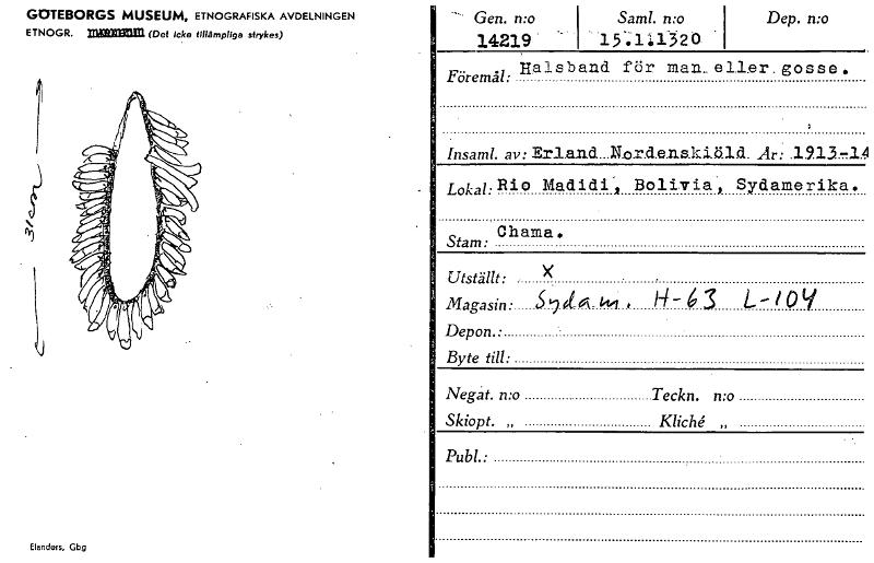 • GOTEBORGS MUSEUM, ETNOGRAFISKA AVDELNINGEN ETNOGR. mom= (Det icke tillämpliga strykas) Gen. n:o 14219 Sam!. n:o 15.111320- Dep. n:o Halsband för man._ eller. gosse . Föremål: Insaml. av: Erland...N.o.... Visa hela