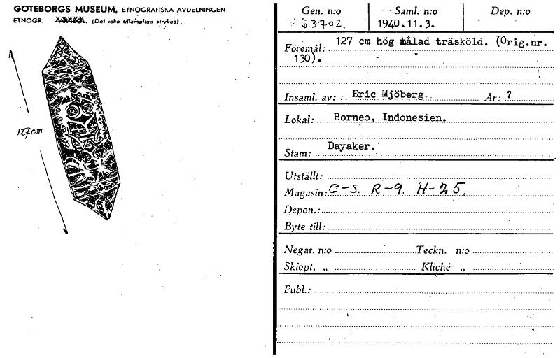 • Dep. n:o GOTEBORGS MUSEUM, ETNOGRAFISKA AVDELNINGEN ETNOGR. MiglY4Ä. (Det icke sirYkes) Gen. n:o Cri 3 1-0 2- Saml. n:o 1 1940.11. 3. 127 cm hög ;glad träsköld. (Orig.nr. Föremål: 130). Mjöberg-.. Itisaml. av- - Eric Är: ? Lokal: Borneo, Indonesien. Dayaker. Stam: Utställt: Magasin:C —5' Depon.: Byte till: Negat. n:o Teckn. n:o Skiopt. „ Kliche: „ Publ.: R ~9, [ocr]