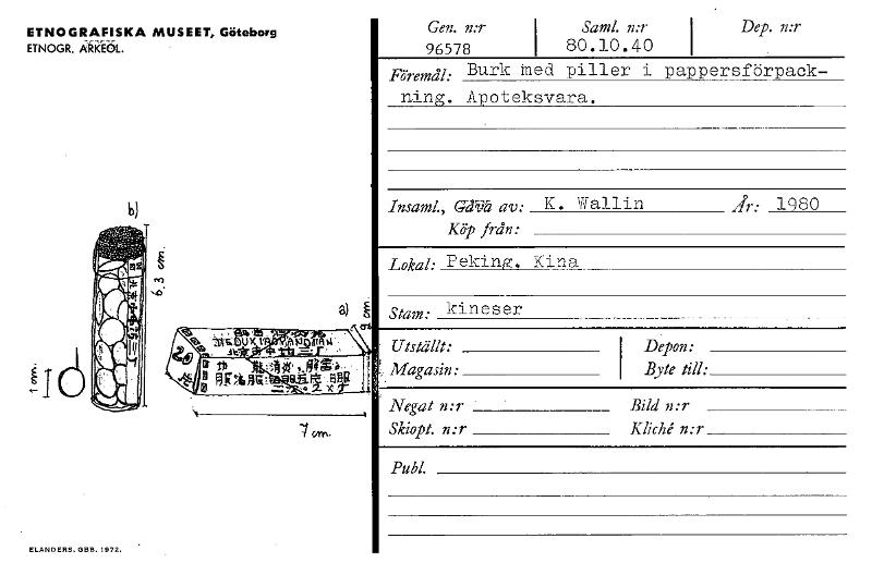 ETNOGRAFISKA MUSEET, Göteborg ETNOGR. Gen. n:r SamL n:r I Dep. n:r 96578 i 80.10.40 a) å Föremål Burk med piller i pappersförpack- ning. Apoteksvara. Insam4 GJOh av: K. Wallin jr. 1880 Ap från: Lokal: Peking, Kina Stam: kineser Utställt: Depon: Magasin: I Byte till. Negat n:r Bild n:r Skiopt. n:r Klichl. n:r PubL ELANDERS.G9121.1972. [ocr]
