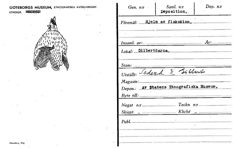 • GOTEBORGS MUSEUM, ETNOGRAFISKA AVDELNINGEN E T N OG R. EarK« El«nders, Obg Gen. n:r Saml. n:r Deposition.. Dep. n:r . Föremål: Hjelm av..fiskskinn. • Insaml. av • • Är: Lokal: Gilbertöarna,, Stam: Utställt: 'f'''T- 7/ ".4174 Magasin: Depon.: Av Statens Etnosrafi ska Museum. Byte till: Negat n:r Teckn n:r Skiopt. „ Kliche „ • Publ. [ocr]