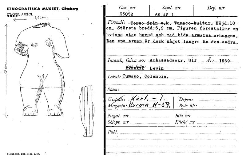 93052 i 69.42_1_ Saml. n:rFöremål: •Torso från 41,1c, Tumaeo-kultur,fläjcb.19- cm, Största bredd:6,2 cm. Figuren föreställer_en kv iflfta_utan_huvud_o.ch_Med_båda_armarna_avhuggna, Den ena aen är Aock_något_längre_Än_den-andre, Insaml., Gåva av: Mnbassftdsekr. Ulf 1969 igibiff41: Lewin Lokal: Tumaco, Colombia, Stam: Uts It: X k- / .. I Depon: Magasin: 1/Cina I Byte till: Negat. n:r Bild n:r...
