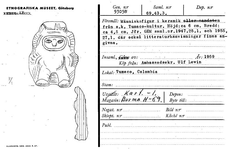 ETNOGRAFISKA MUSEET, Göteborg XEDRIVSKAYKEOL GO4 1LT 9305& 1 Sand. mr 69.43,3, Dep. n:r Föremål.. Wänniskoligur...i...keramik 9-1-143-r--e.a,a444.en Tumaco-kultur. Höjd:ca 6 em, Bredd: ca 4,5 em, Jfr. GHM saml.nr.1947.25.1, och 1955, 27,1. där också litteraturhanvisningar finns an- givna. jGdgkz av: Ar: 1969 Köpftån: Ambassadsekr. Ulf Lewin .Tumaco, Colombia Lokal. Stam: Uts /62. Depon: Magas...