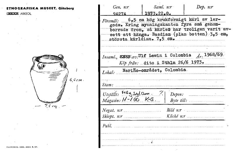 ETNOGRAFISKA MUSEET, Göteborg ERIXICX: ARKEOL. 7, 6. Colz Gen. n:r Sam. i. n:r Dep. n:r 94974 1973.22.8. Föremål: 6.25,cm hög krukfdrmigt kärl av ler- gods. Kring mynningskanten fyra små genom- borrade öron, så kärlet har troligen varit av- sett att hänga. Basdiam (plan botten) 3,5 cm, största kärldiam. 7,5 Insaml., Priif:av..IIif Lewin. i Colombia jr: 1968/6a. Köp från: ....dito .1 Sthlm 26/6 19...