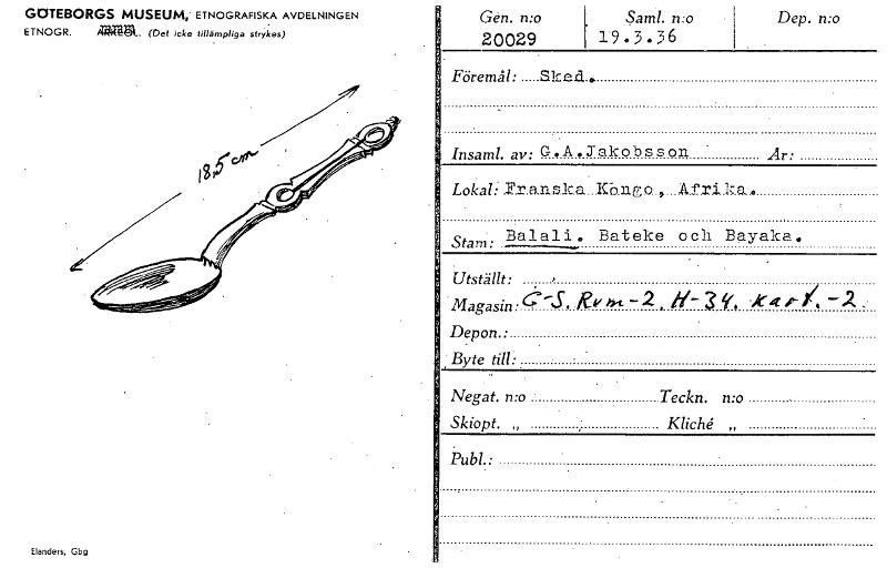 • GC1TEBORGS MUSEUM,. ETNOGRAFISKA AVDELNINGEN ETNOGR. 141ggl.. (Det icke tillämpliga stryk. es) Gem. n:o Saml. n:o 20029 19.3.36 Dep. n:o Föremål: Sked. Insaml. av:G,A.Jakobsson Lokal Stam: Balali. Bateke och Bayaka. Utställt: Magasin• kk h-c -2 , ./t4 /- /, Depon.: ;Byte till: Negat. mo Teckn. n:o Skiopt. „ „ Publ.: År: Elanders, Gbg [ocr]