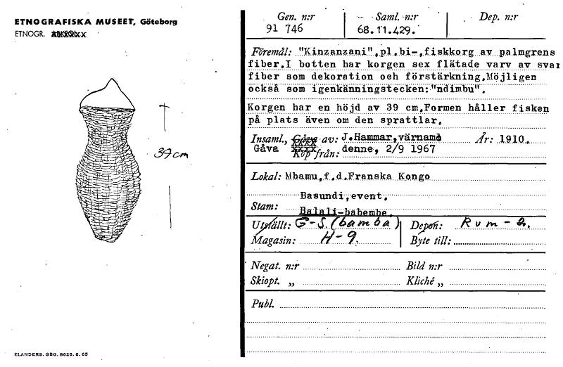 ETNOGRAFISKA MUSEET, Göteborg ETNOGR. kett~X ' . Gen. n:r 91 746 - Sand. n:r 68.1.1.429.• .. Dep. n:r Föremål: "Kinzanzani",pl.bi-,fiskkorg av palmgrens fiber.I botten har korgen sex flätade varv av sval fiber som dekoration och förstärkning,Möjligen också som igenkanningstecken:"ndimbe. Korgen har en höjd av 39 cm,Formen håller fisken på plats även om den sprattlar, Imand.,filkyav:J.Hammar,värnam& fr: 1910. Gåva eo.dindanne, 2/9 1967 39C-i' Lokal: hibaum,f..d.Frauska Kongo Basundi,event, Stam: - abem ut ällt: as- S. 441`t )1 Depol rPt - 4 . Magasin: I Byte till: Negat. n:r Bild n:r Skiopt. „ Kliché,, Publ. ELANDERSA626.6.65 [ocr]
