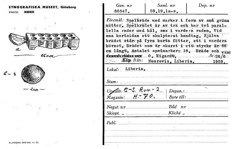 ETNOGRAFISKA MUSEET, Göteborg ETNOGR. 74KM e_ s ELANDERS. GBG 502. 11. 53. Gen.- n:r 86547. Sam!. n:r i 59.19.1a-rs, Dep. n:r Föremål: Spelbräde...med...marke.r...i...form...av..små. grönz nötter, Spelbrädet är av trä och har • två paral- lella rader med. hål„ sex i vardera' raden, Vid ena kortsidan ett. skulpterat handtag, Själva - brädet ståri.- pi fyra- korta fötter,, ett i vardera hörnet„ Brädet-som.•.är-skuret-i-ettc-stycke.••är-66' cm-långt, Antalet -spelmarke-rv- 18, Bbädc-och -- ität 21xsarab4xEoiticax= 0., Wigardtt, från: Ifonrovia ' Liberia, 1959 • Lokal:.. Liberia, Stam: Updlt: e --•5‘. R i/ t's - 2 . Magasin: H- 7 0, Depon.: Byte till: Negat. n:r Bild n:r Skiopt. >, . Kliché „ Publ. . • [ocr]