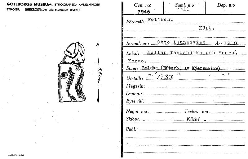 GOTEBORGS MUSEUM, ETNOGRAFISKA AVDELNINGEN ETNOGR. rägneari(Det Icke tillämpliga strykas) Elanders, Cbg Gen. n:o . - 7946 - Sam!. n:o • . 4411 Dep. n:o Föremål: Fetich. Köpt. Insaml. av: Otto Ljungqvist År: .1.9.10 Lokal: Mellan Tanganjika och Moe-ol, ....Koml,o - Stam: ..Baltilla....(Eftarb-,...av..Kjersmaier) Utställt: ' /: 33 Magasin. Depon.: . Byte till: Negat. mo Teckn. n:o . Skiopt. „ Kliché „ Publ.: . [ocr]