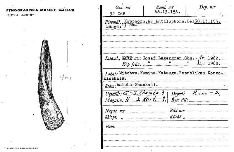 ETNOGRAFISKA MUSEET, Göteborg ETNOGR. -ARiffet-7 Gen. MT. 92 068 -Saml. 68.13.156. Dep. n:r Föremål: Kopphorn,av antilophorn.Se :68.13.155, Längd:17 cm. Insaml.,1" av: Josef Lagergren Gbg. År: 1962 . tt " År: 1968. Lokal: Mitobwa,Kamina,Katanga,Republiken Kongo- Kinshasa-. stam:b aluba-Shankadi. Ut It: Magasin: anm 44 ) 4 /re2)-Y', —1,1 De Byte till: g 4, Negat. n:r Skiopt. „ Bild n:r Kliche „ Publ. Köp från: ELANDERS. GBG. 8626. 6. 65 [ocr]