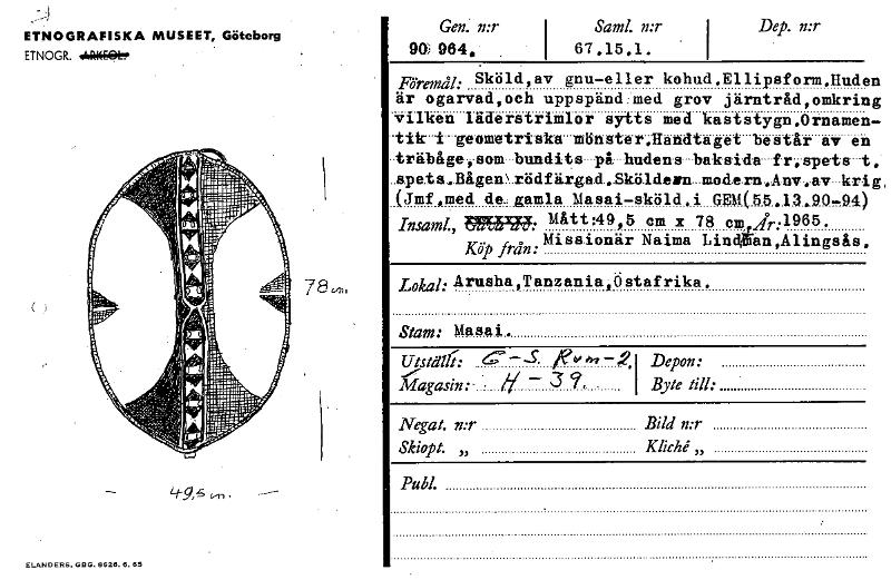 ETNOGRAFISKA MUSEET, Göteborg ETNOGR. 4-9,5 ELANDERS. GBG. 9628. 6. 65 Gen. n:r 90) 964. Saml. n:r 1 67.15.1. • Dep. n:r i Föremål: Sköld,av gnu-eller kohud.Ellipsformalud< är ogarvad ,och uppspänd:med grov järntråd , omkrir vilken laderstrimlor sytts med kaststygn.Ornamer tik-i-geometriska-mönstelv.Erandtaget består av ex •.träbåge.i.som-bundits•p•-•udens..•baksida...fr,spets..1 ..s.pets..Båge.n\xödfärgad..Sköldeirn..modern.Anv..av...kri (Jmf ,med de.: gamla Masai-sköld. i 62M(.5.5.11.9.0,94) Insaml., Witlxiff: Mått:49,5 cm x 78 cm iir:1965. Köp från: Missionär Naima Lin an,Alingsås, Lokal: Arusha oTanzania..Östafrika. Stam: Masat. UtsteK: 4 - S. flit 41 - 2.1 .....," — Magasin: - • 3 9. . Depon: I Byte till: Negat. n:r Bild n:r Skiopt. „ Kliché,, Publ. n g g. [ocr]