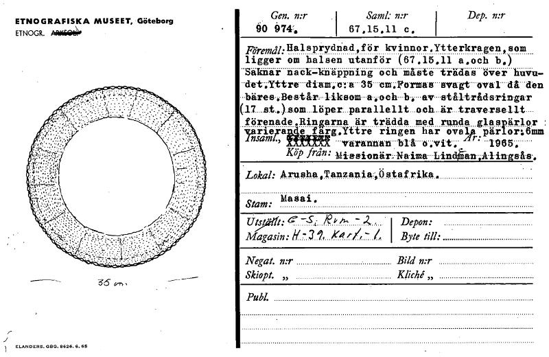 ETNOGRAFISKA MUSEET, Göteborg ETNOGR. Afkidiii41 ELANDERS.GEIG~6.66 Gen. n:r 90 97,t. 1 Saml: n:r 67,15.11 c. Dep. n:r 1 . . FöremåhHalsprydnad,för kvinnor.Ytterkragen,som ligger om halsen utanför (67.15.11 a,och b,) Saknar nackknäppning och måste trädas över huve det.Yttre diam.c:a 35 cm.l!orman alme oväl då di .hären,Består,liksom-a..och b, av. ståltrådsringar (17 st...)..s.om...1ö.per..parallellt...och...är...travers.e.11t.... förenade.Ringarna är trädda med runda glaspärlor nrk.ave!arg.Yttre ringen har ovalA.pärlor16) 4,4164 -väninnan-MA' t,vit.,:"" 1965, Köp från: Iliasionär:Nnima-Lind4n4klings-å-s. . . Lokal: Arusha,Tanzaniar,Ö staf rika . Stam: liaSai. Utst- t: e. - • 5 i R i - .R. Magasin: Y -3 1, )(4 - t, i Depon: i Byte till: Negat. n:r Bild n:r Skiopt. „ Kliche. „ Publ. [ocr]
