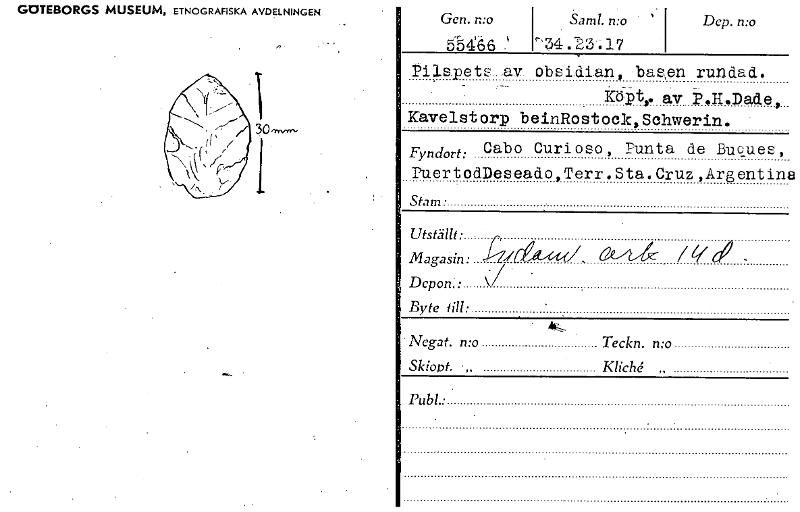 • GOTEBORGS MUSEUM, ETNOGRAFISKA AVDELNINGEN Gen. n:o Samt. ' 51466 Pilspets—av obsidian, basen rundad. Dep. n:o K..15p1,. av P.H.Dade, Kavelstorp beinRostock,Schwerin. Fyndort: Cabo Curioso, Punta de Bucues, ruertodDeseado,Terr.Sta.Cruz,Argentina Stam. Utställt: Magasin: ae---44 Depon.: Byte till: Negat. n:o Teckn. n:o Skiopt. „ Publ.: ............ [ocr]