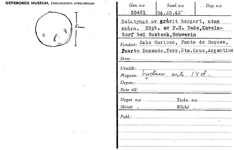 • GOTEBORGS MUSEUM, ETNOGRAFISKA AVDELNINGEN i Gen. n:o • Saml. tuo . Dcp. n:o.5.5491- 34,23,42- Dolatyngd av gråvit bergart, utan _skåra, Köpt. av P.H. Dadejavels— torf bei Röstock,Schwerin 71cloå: Cabo Curioso, junta de Buques, Puerto Deseado,Terr.Sta.9ruz,Argentin4 Stam • ~IP Magasin: Depon.: Byte till: ogit-Gu . ( (-K ci , Negat. n:o Teckn. n:o Skiopt. „ KlicU „ Publ.: [ocr]