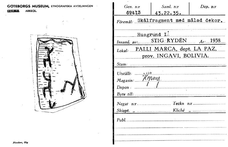 GOTEBORGS MUSEUM, ETNOGRAFISKA AVDELNINGEN ~e, ARKEOL. Blandare, Oby Gen. n:r ___•_____69:2111411222352_____ ___•_____69:2111411222352_____Sam!. n:r Dep. n:r Föremål: Skålfragment med målad dekor. Husgrund IL Insaml. av • STIG • RYDÉN År: 1938- Lokal: PALLI MARCA, dept. LA PAZ, prov. INGAVI, BOLIVIA. Stam: Utställt: Magasin: 76~ • Depon • i • Byte till: Negat n:r Teckn n:r r, Skiopt. „ Kliché „ Publ.. • [ocr]