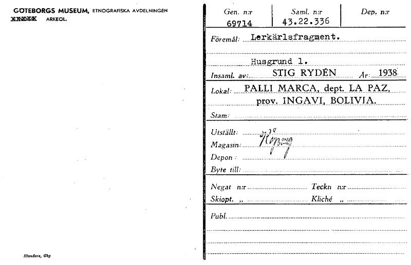 • GOTEBORGS MUSEUM, ETNOGRAFISKA AVDELNINGEN ]E] ARKEOL. Elanders, Gbg Gen. n:r 69714 Saml. n:r 43.22.336 Dep. n:r • Föremål: Lerkärlsfragment. Husgrund 1. : InsamL av- STIG RYD1N Ar: 19381 Lokal: PALLI MARCA, dept. LA PAZ, prov. INGAVI, BOLIVIA. Stam: I Utställt: ,. 7 Magasin: Depon : I Byte till: Negat n:r Teckn n:r Skiopt. „ Kliché „ Publ. [ocr]
