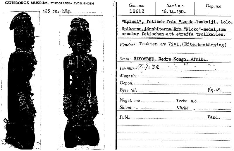 GOTEBORGS MUSEUM, ETNOGRAFISKA AVDELNINGEN 125 cm. hög. . Gen. n:o Sam!. n:o 18 613 16. 14.150 . %gnöl", fetisch-från 2Londe-lwakaijiy. Lolo. I_Spikarnadärnbitarnaäro "N1oko!'7Mede1:,som orsakar •fe...