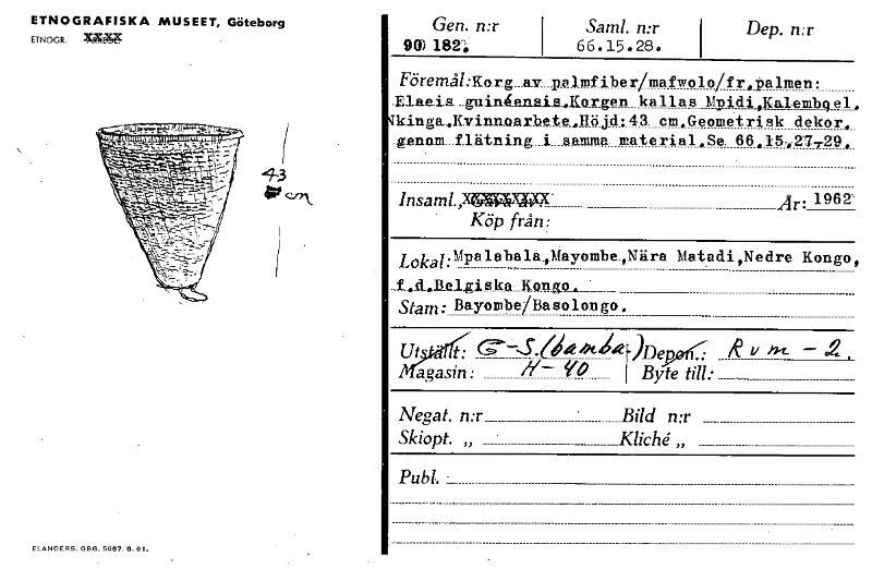 ETNOGRAFISKA MUSEET, Göteborg ETNOGR. XPKA9; Gen. n:r 90) 1921 Sam!. n:r 66.15.28. Dep. n:r Ii • /11(11111116 .3" ( CrYk. Föremål:Korg...av. lmf iberbsafwolo/fr..palmen : Elaeis_guink_ensis ,Korgen k...