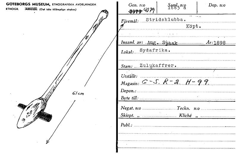 • År:1898 Insaml. av: ...A GOTEBORGS MUSEUM, ETNOGRAFISKA AVDELNINGEN ETNOGR. ~AZ (Det Icke tillåmpliga strykes) Gen. n:o 49549' £/a ,t)trgl5n..8 Dep. n:o F-temål: Stridsklubba. Köpt. Lokal: Sydafrika... Visa hela