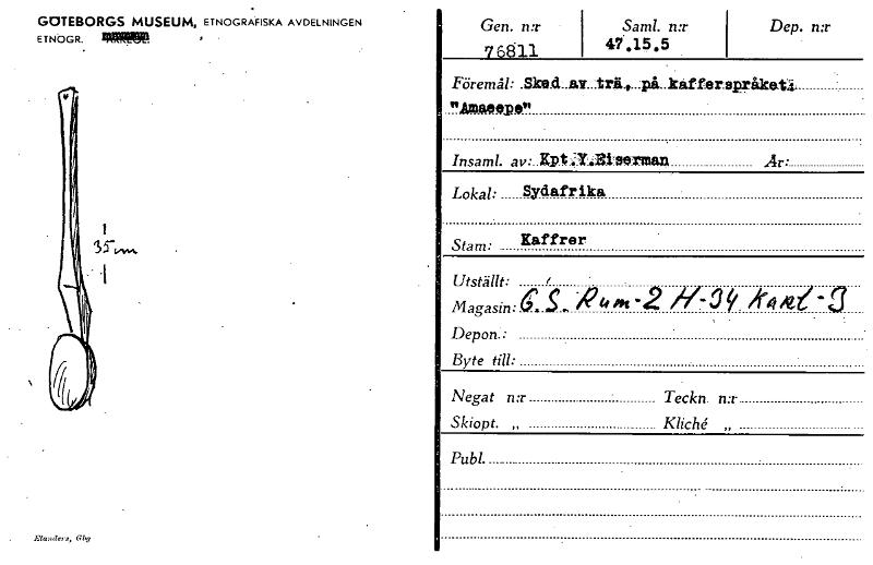 GOTEBORGS MUSEUM, ETNOGRAFISKA AVDELNINGEN ETNOGR. 144~ El«nder , Gbg - Gen. n:r '76811 Sam!. n:r 0.15 ,5 Dep. n:r Föremål: .Ske.d.. av.. trit.,..4.å.. kliffe repråket Ä Insaml. av:..Zp.t.:Trineginnan År: Lokal: Sydafrika - Stam: Kaffrar , Utställt: 1 • Magasin:. .. /?tim 2 Depon.: . Byte till: Negat n:r Teckn. n:r. , Skiopt. „ Kliché „ : Publ. [ocr]