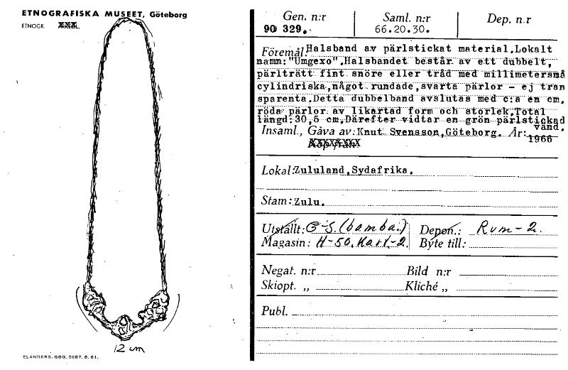 Dep. nr • Gen. n:r 90 329., Sam!. n:r i 66.20.30. Föret Aalsband av pärlstickat material.Lokalt namn:"Umgexo".11alsbandet består av ett dubbelt, pärlträtt fint snöre eller tråd med miIlimelersmå cylindrlska,något,rundade,svarta pärlor — ej tran sparenta.Detta dubbelband avslutas med c:a en em, röda- pärlor av likartad form och storleMotal längd:30,5 cm.Därefter vidtar -en grön pärlstickad Insaml., Gåva av:_Knut, Svensson Göteborg. ,4r: van • • Lokai:Zululand,Sydafriks. Stam: zulu. ut (I It.) agasin : # - 50 . Negat. n:r_ Bild n:r Skiopt. „ Kliché,, Pub!. 1966 KW9rEsfix De /e — Byte till: ETNOGRAFISKA MUSEET, Göteborg ETNOG R. KM. ELANDERS.. GGR. 5687.13. 61. [ocr]