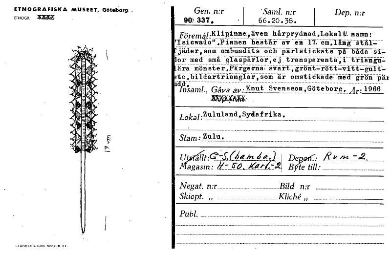 ETNOGRAFISKA MUSEET, Göteborg , ETNOGR. 'MKR ELANDERS. GBG. 56E17. El. 61. Gen. n:r 'Sam!. n:r 90)337. -1 . 66.20.38. i Dep. n:r Föremg:KliP innstäven hårprydnad.Lokalt,namn:. Usiewaion.Pinnen består ...
