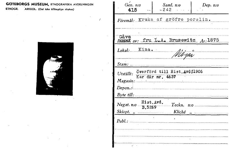 • GOTEBORGS MUSEUM, ETNOGRAFISKA AVDELNINGEN ETNOGR. 'ARKEOL. (Det Icke tittårnpliga strykes) Gen. n:o 415 Saml. n:o -.242 . Dep. n:o Föremål:Kruka af gröfre porslin. Gåva raWitav: fru L.A. Brusewitz... Visa hela