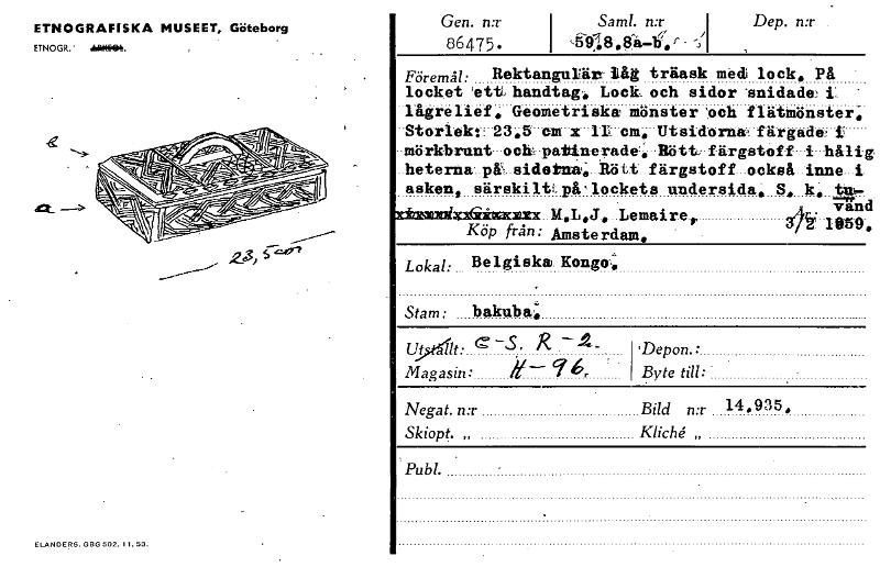 ELANDERS. 080 502. Il. 53. Gen. n:r 86475. Sam!. n:r Dep. n:r I SIC, 8 ,,87å-l; r • 1 ' Föremål: Rektangulärc locket lett: handtag. 'lågrelief, Geometriska -Storlekv-23.5.--em • mö rkbrunt --o ck, Tal:line-rade', ..heternai.pL.sidoima,...Bött. asken, särskilt: .:••••■•••-, ...: x.xeribaarnaxx. iåg Lock. x IL -em. på' lockets Amsterdam. träask mö& lock, På och sidor -snidade: il " mönster 'och flätmönster; Utsidornal färgade: i Hö tty - färgstoff - -i- -håli; färgstoff...o.ckså ..inne-1 undersida, S, k,, tu:- •-,„.•-• M„L„J., ..Lemairer van1• Köp från: Lokal: Belgiska Kongo, • . . Stam: bakuba: Ut /t: ..---S. X -4- Magasin: g — 7 6, ' 'Depon.: Byte till:. . , Negat. n:r Bild mr 14.935• Skiopt. „ Kliché Pub!. ETNOGRAFISKA MUSEET, Göteborg ETNOGR. [ocr]