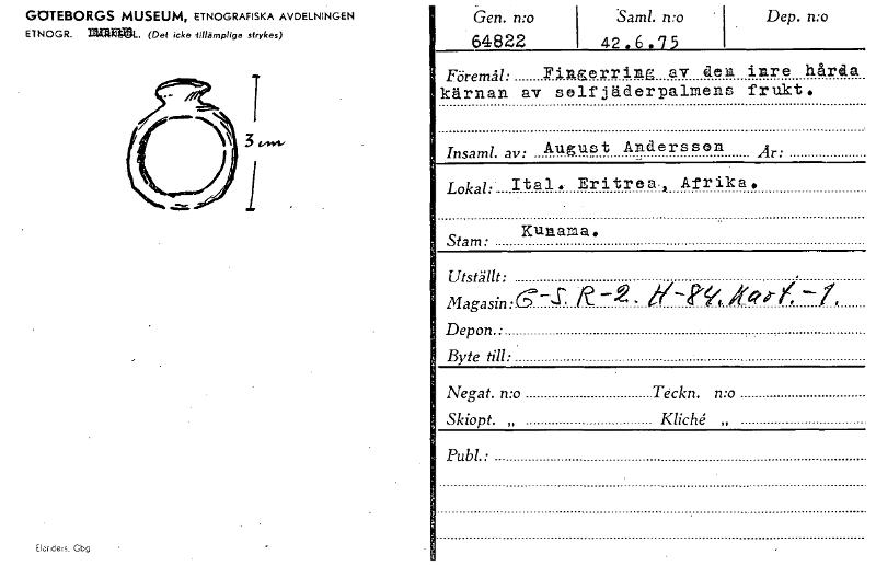 GCITEBORGS MUSEUM, ETNOGRAFISKA AVDELNINGEN ETNOGR. ramm_ (De( icke tillämpliga strykes) Ele.ndms,Gbg Gen. mo 64822 Saml. mo 1 42.6.75 Dep. n:o Föremål: Fingerring av den inre hårda kärnan av solfjäderpalmens frukt. Insaml. av: August Andersson Är: Lokal: Ital. Eritrea,, Afrika. Kunama . Stam: Utställt: , Magasin:G-1 i. Ir"-4-P1,- t• Depon. • Byte till: • Negat. mo Teckn. n:o Skiopt. „ Kliché „ Pub!.: [ocr]