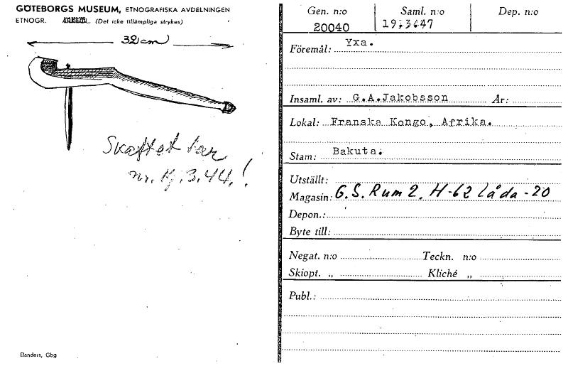 • Dep. n:o GOTEBORGS MUSEUM, ETNOGRAFISKA AVDELNINGEN ETNOGR. atterZL. (Det icke tillämpliga strykas) Gen. n:o Sam]. no 20040 I, 19; 3 ‘.47 e 96- VU ( r Föremål: Yxa. Insaml. av: G .Jakob s son. Är: L... Visa hela