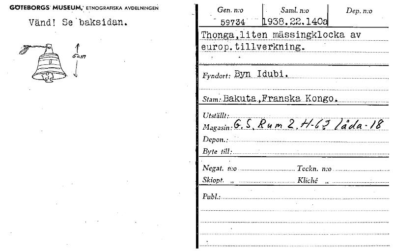 • GOTEBORGS MUSEUM,' ETNOGRAFISKA AVDELNINGEN Vänd! Se 'baksidans Gen. n:o .Samt. n:o Dep. n:o L - 59734 938. 22.140 Thonga,iiten mässingklocka av europ.tillverkning. Fyndort: EAYn Idubi. stam: Bakut a ... Visa hela