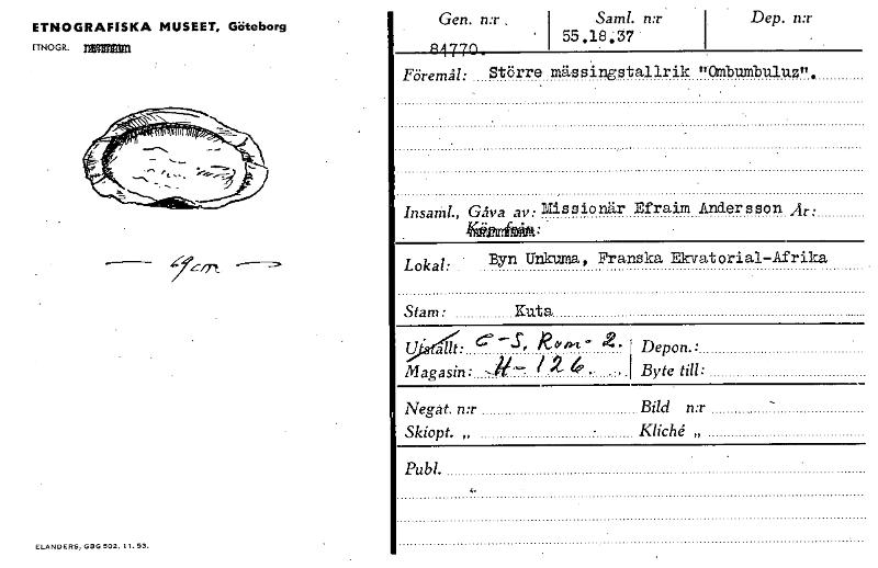 Gen. n:r _ ETNOGRAFISKA MUSEET, Göteborg FTNOGR. flfl Samt. n:r 55,18,37 Dep. n:r 81 7 7 0 - Föremål: Större mö,ssingstallrik i Ombumbuluz", Insainl., Gåva av: Missionär Efraim Andersson År: Kaärmilån: 777"t_ Lokal: Stam: Byn Unkuma, Franska Ekvatorial—Afrika Kuta U allt: le&n-t° Magasin: ... Depon.: Byte till: Negat. n:r Skiopt. „ Bild n:r Kliché „ Publ. ELANDERS, OBS 502. 11. 53. [ocr]
