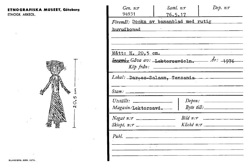• ETNOGRAFISKA MUSEET, Göteborg ETNOGR. ARKEOL. ELANDERS.GBEL1972. Gen. 71.T 94931 I Saml.11.T 76.5.17 Dep. 71.T i Föremål: Docka av bananblad med rutig huvudbonad Mått : H. 20,5 cm. käffitgirdc Gåva av... Visa hela