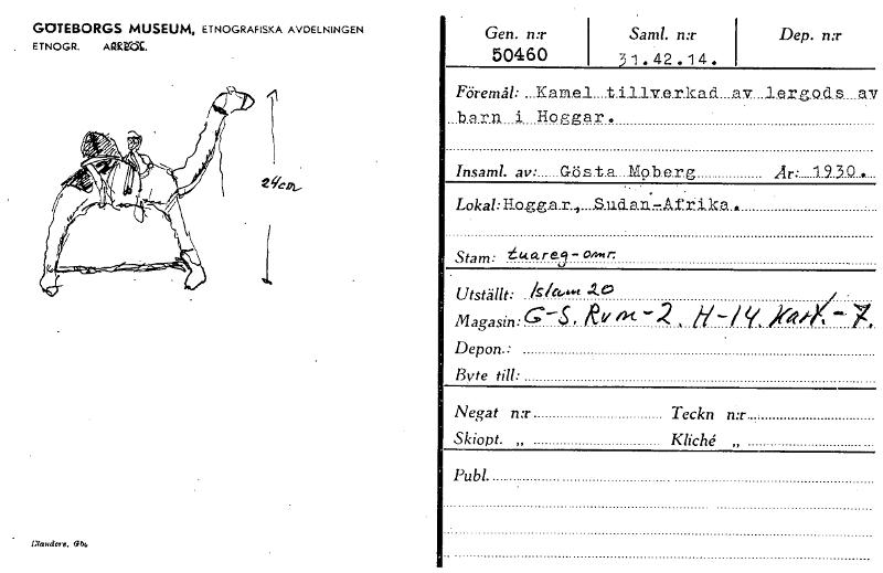 • GCITEBORGS MUSEUM, ETNOGRAFISKA AVDELNINGEN ETNOGR. Anra. Gen. n:r 50460 Samt. n:r 31 . 42.14. Dep. n:r Ulandere,(04 Föremål: . Kamel tillverkad av lergods av barn i Hoggar. Insaml. av: G.ö.st.a. Ido.... Visa hela
