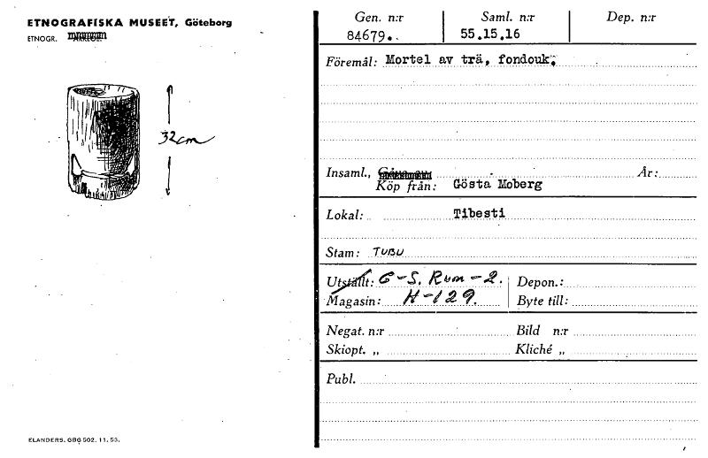 • ETNOGRAFISKA MUSEET, Göteborg ETNOGR. nagga Gen. n:r 84679. I Sam!. n:r I 55,15,16 Dep. n:r Föremål: Mortel av trä, fonclouk; Lokal: Tibesti Insaml., gthantirg År Köp från: Gösta Moberg Stam : Tuf3u ... Visa hela