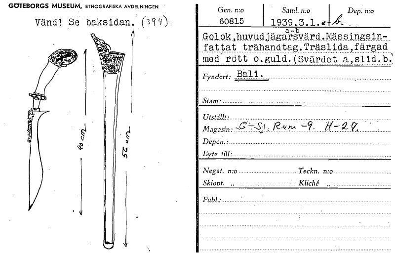 • GOTEBORGS MUSEUM, ETNOGRAFISKA AVDELNINGEN Vänd! Se baksidan.' CIV"), 1 - Gen. n:o Saml. n:o Dep. n:o60815 1939.3.1.E a-b Golok, huvudjägarsvärd. Mässingsinfattat trähandtag. Träslida, färgad med rött... Visa hela