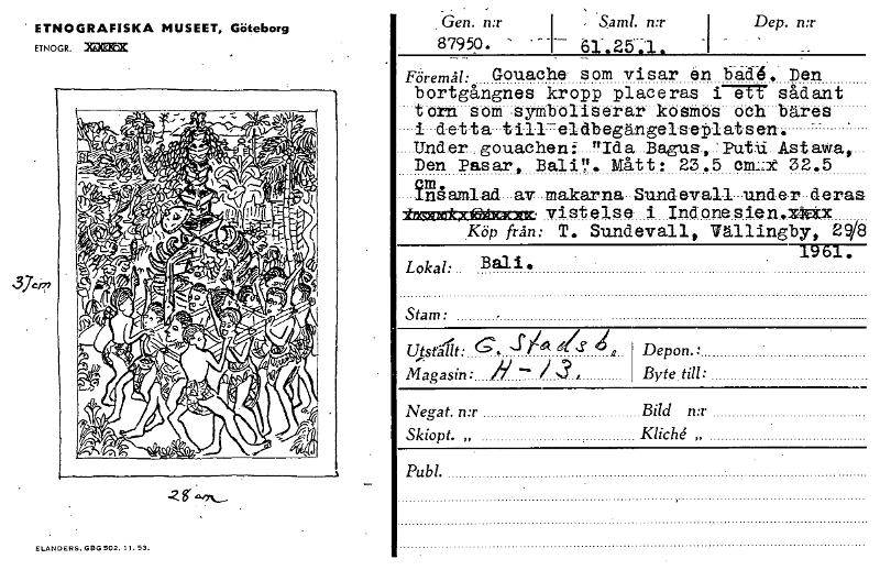 ETNOGRAFISKA MUSEET, Göteborg ETNOG R. XXXX 37.0 ELANDER5, GE1G 502. 11.53. . Gen. n:r. Saml. n:r 87950- ' --Ii -- 61.25a. 1 Dep. n:r Föremål: Gouache som visar en iii:c14. Den bortgångnes kropp placeras i= sådant torn som -symboliserar kosmos och bäres --- i-d-etta -- tilrsidbegängelseplatse-n. Under.: gouachen.: "Ida. .Bagus., 'Putä. Ast.awa,... Den Pasar, BaliT!. Mått: 23.5 em.:1X 32.5 %m. samlad .av makarna Sundsvall- under deras ±~-xchricar: vistelse i Indonesien.~c Köp från: T. Sundevall, Vällingby, 29/8 . Lokal: Bali. 1961. . Stam : - Utställt: C. j 6 IS i d ... Depon.: Magasin: ./71 — / 3 Byte till: Negat. n:r Bild n:r Skiopt. „ Kliché „ Publ. [ocr]