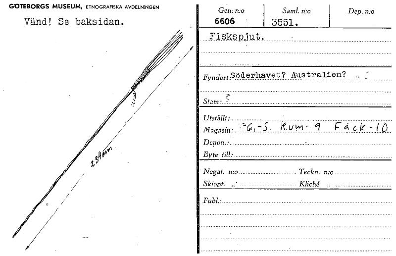 • Fiskspjut. GÖTEBORGS MUSEUM, ETNOGRAFISKA AVDELNINGEN Vänd! Se baksidan. • Gen. n:o 6606 Sam!. 3551. Dep. n:o Fyndort. Söderhavet? Australien? Stam • • Utställt. Magasin:1'I- 7 r c Ic - Depon. • Byte ... Visa hela