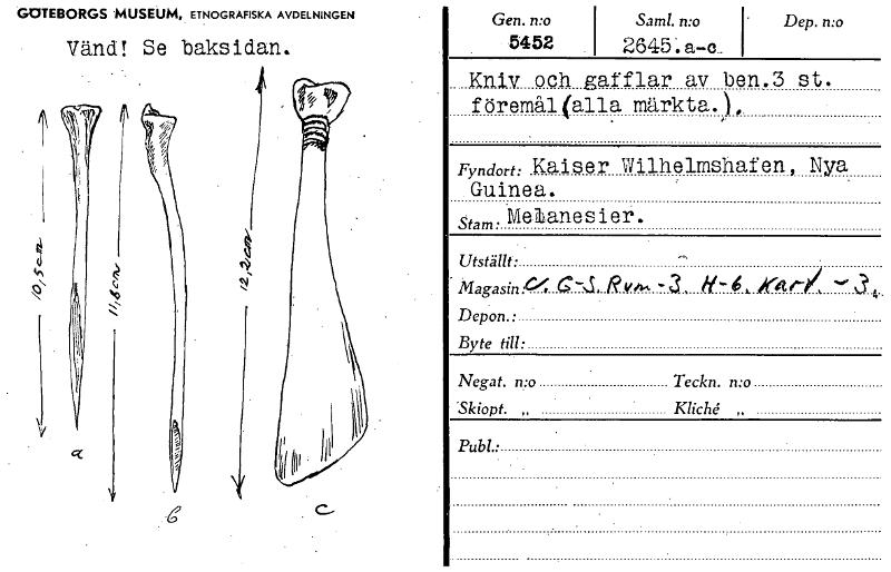 GOTEBORGS MUSEUM, ETNOGRAFISKA AVDELNINGEN Vänd! Se baksidan. Gen. n:o 5452 Saml. mo 2645:a-e.. Dep. mo Kniv och gafflar av ben.3 st. föremål alla märkta. , Fyndort: Kaiser Wilhelmshafen, Nya Guinea....