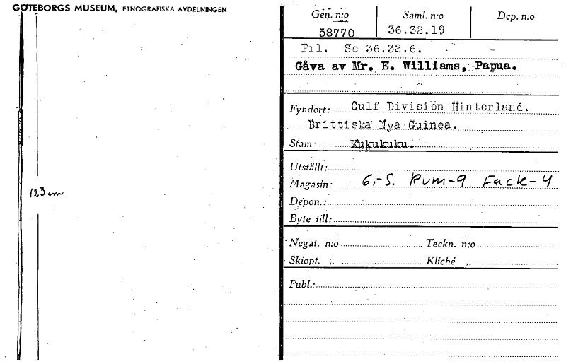 GOTEBORGS MUSEUM, ETNOGRAFISKA AVDELNINGEN Saml. n:o 58770 36.32.19 ri1. ge 36.32.6. Dcp. ri:o Gåva av Mr., E. Williams, Papaa. Fyndort: Culf Divisibn 5interland. Brittiska Nya.Cuinea. Stam • Zggukuk...