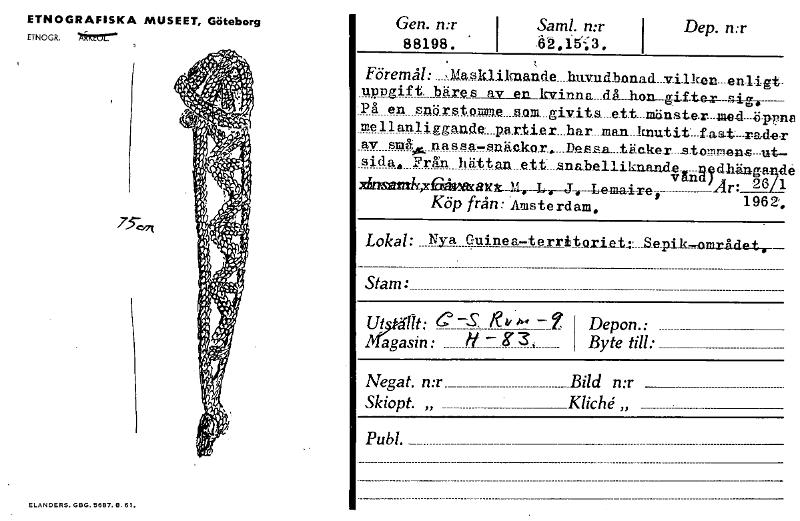 • ETNOGRAFISKA MUSEET, Göteborg ETNOGR. »Mr. 75,„t ELANDERS. GEIG. 5687. e. 61. Gen. n:r 88198. Saml. n:r I .9.2.15.;3. Dep. n:r I Föremål: ,- Ma skliknande. huvudbonad_villeen---en-l-igt- _uppgif t. b... Visa hela