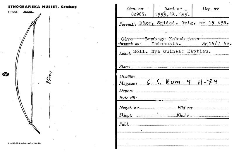 • ETNOGRAFISKA MUSEET, Göteborg ETNOGR. .4tRICE01.- ELANDERS. GBG. 3870. 10.51. Dep. nr Föremål: Båge. Snidad. Orig. nr 15 498. Gåva Lemlyaga KehudaSaan Armx2k av • Indonesia. 41.1.57.7 .... 53. Lokal... Visa hela