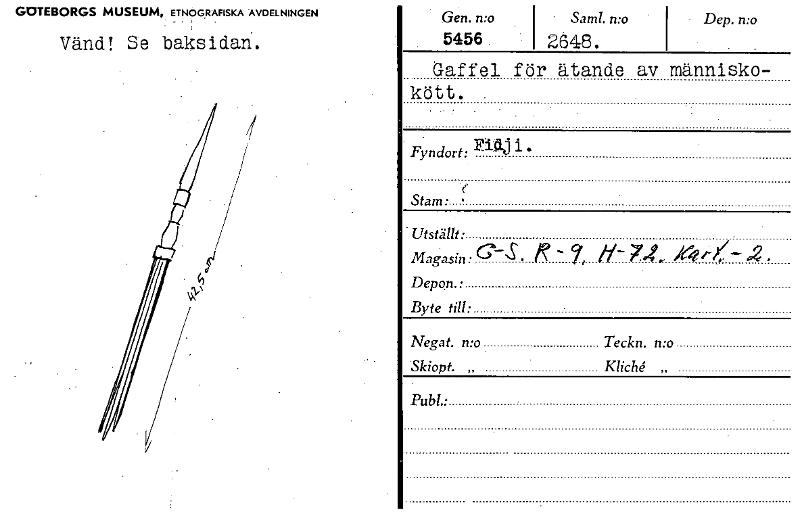 • GOTEBORGS MUSEUM, ETNOGRAFISKA AVDELNINGEN Vänd! Se baksidan. Gen. n:o • Saml. mo 5456. . 2648. Dep. mo Gaffel för ätande av människo- kött. Fyndort: Fi4j• Stam • • Utställt • Magasin • S . - 7, il... Visa hela