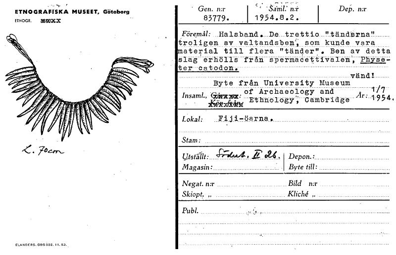 . 1 /7 Byte från University Museum of Archaeology and Insaml., 29:X • . . Ethnology; Cambridge ETNOGRAFISKA MUSEET, Göteborg ETNOGR. NCEOCX ELANE~EIGåe2.11.53.. • Gen. n:r 'Sån n:r 83779. 1954.8.2. DeP. n:r Föremål: Halsband. De trettio "tänderna" troligen av valtandsben`; som kunde vara aterial till flera "tänder". Ben av detta slag erhölls från spermacettivalen, Physe- ter catodon. vändl Lokal: Stam: Lystgiu: J9:74,a,Ac2(. Magasin: Negat.n:r Skiopt. „ Publ. . Depon.: Byte till: Bild n:r Kliché „ [ocr]Stäng