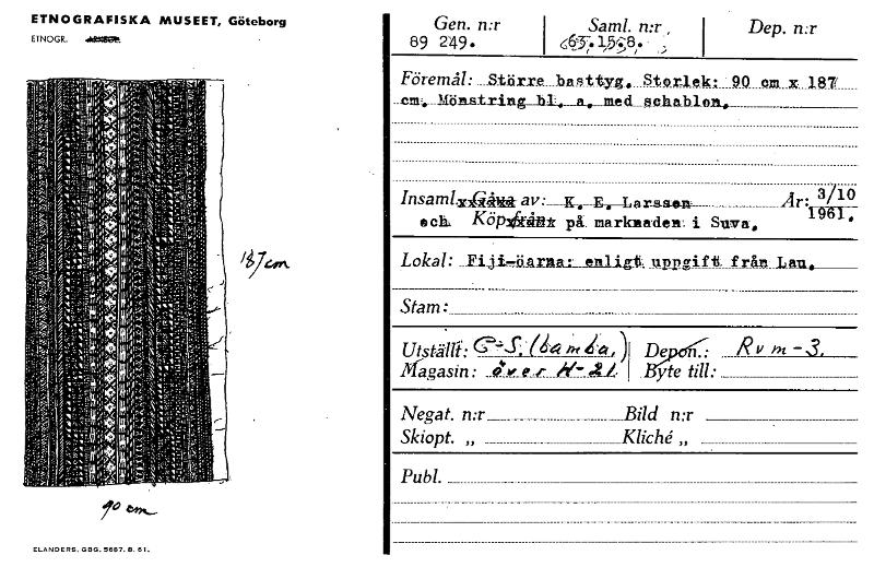 ETNOGRAFISKA MUSEET, Göteborg ETNOGR. .11«86.M. Gr" ELANDERS. ABS. 5687. 8. 61. Gen. n:r 69 249. I Saml. n:r, I 6e5;"375.58/°• ,; I I Dep. n:r Föremål: .._.Stiir_re hetB.tty.g. ._.cm.___116astring Vt, _a.. ntecL Storlek: ocliallois, son, i 90 cm. x. 187 insamimaaki• av: • ock KäPitliffir K, Ar: 3/10 på. markRadezu: Suv 1961.a. Lokal:.__F_i_j_i_.eiria_raa_t_ re_nizt Stam: u_p_pgif tt. frårt._lazt,_ Utställt: • Si_16-42Y 64. i ) M 4% agasin: i, e,r kle- at /., 1.13966.: Byte till: R i/ m -3. • Negat. n:r Skiopt. „ . Bild n:r Kliché,, Publ. [ocr]