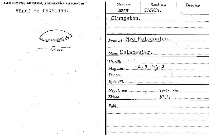 • GOTEBORGS MUSEUM, 'ETNÖGRAFIåKA 'AVDELNINGEN Gen. n:o Samt. n:o 5317 2530h. Slungsten. Vänd! Se baksidan. Dep. n:o Fyndort: Nya Kaledonien. Stam: Melanesier. Utställt: Magasin • 9' 143 Depon.: Byte ... Visa hela