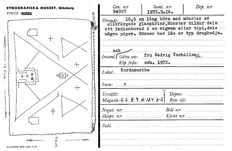 Gen. n:r I Sang n:r I Dep. n:r 94027 19.72'99.169 Föremål: 10. 5> cm lång- börs: med mönster av olikfärgade glaspärlor,Nlönater bildar- dels, ett' Indtanhuvud• i' 'en wigwam eller tipiydels •-några.-...Visa hela