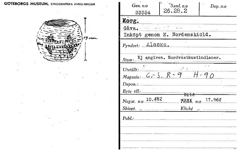 • GOTEBORGS MUSEUM, ETNOGRAFISKA AVDELNINGEN . k Gen. n:o Sard n:o No. n:o 33554 26. 28. 2 Korg. Gåva. Inköpt genom E. Nordenskiöld. Fyndort: Alaska. Ej angiven. Nordvästkustindianer. Stam • Utställt ... Visa hela