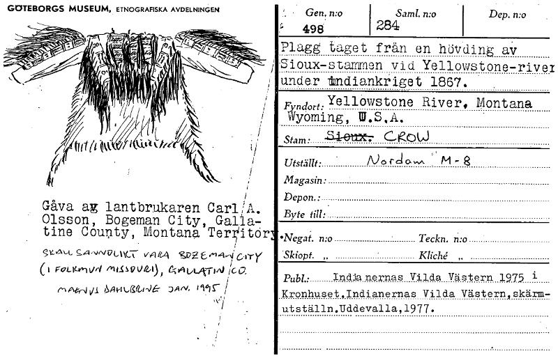 GOTEBORGS MUSEUM, ETNOGRAFISKA AVDELNINGEN Gen. mo Saml. mo Dep. n:o 498 284 Plagg taget från en hövding av Sioux-stammen vid Yellowstone-river under -Indiankriget 1867. Fyndort: Yellowstone River, M...