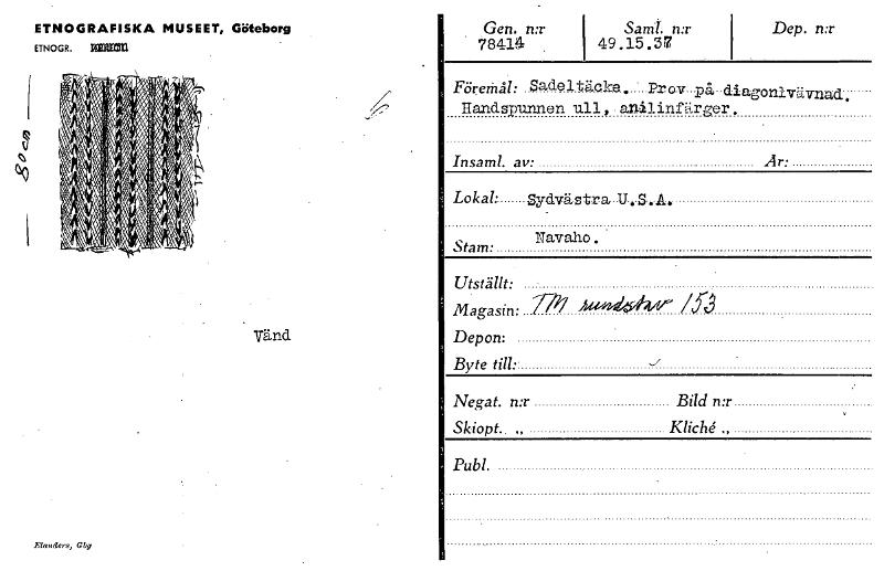 • ETNOGRAFISKA MUSEET, Göteborg ETNOGR. Piziern Gen. mr Sam'!. 78414 49.15.37 Dep. n:r Vänd Föremål: Sadeltäcke. Prov. på-diagenIvävnad, Handspunnen ull , • anilinfärger. Insaml. av: År: Lokal: Sydväs... Visa hela